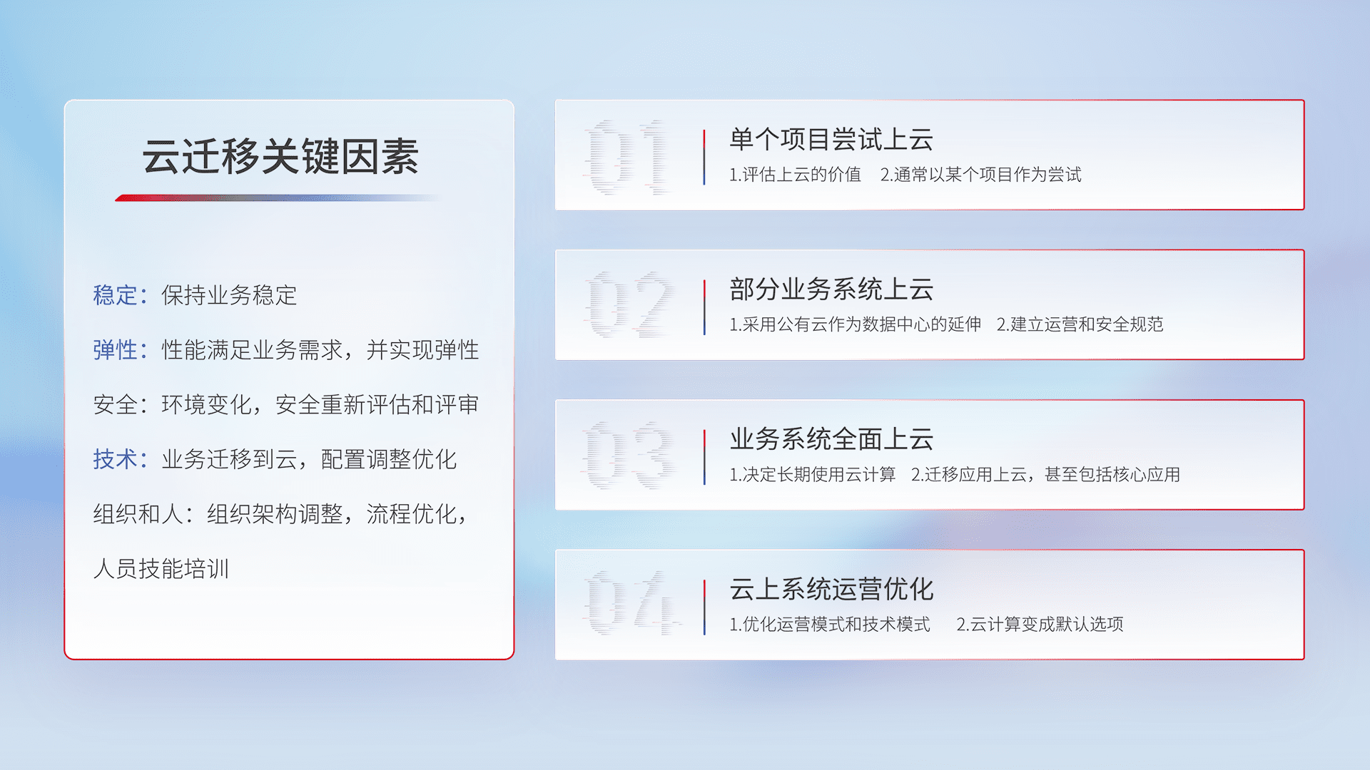 结合实际业务,,,,从规划设计、、、、云平台选型、、云原生改造、、、数据迁移、、、集成交付,,迁移全过程为客户识别最佳上云路径,,做好风险识别管理,,,,设计网络架构、、身份权限、、安全审计合规、、、操作审计、、、、日志审计、、、、监控告警策略、、多站点容灾设计等,,,对云上基础设施进行整体规划,,提升IT治理水平,,,以满足弹性、、、、高可用、、、高性能的需求。。。。