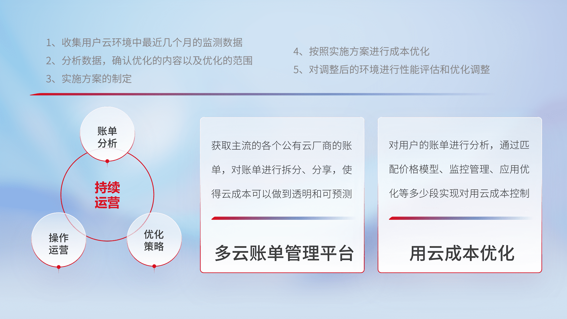 通过多云纳管,,,以统一的资源数据模型把客户的云资源进行抽象和封装,,进而实现对多云资源的统一操作,,保障云资源管理的可靠性、、、、稳定性与可用性。。。量身定制化运维内容,,,配置、、、开发运维、、、、补丁管理、、、、备份、、监控、、、认证和访问管理、、、、审计和日常巡检等,,,,保障在用云过程中的可靠度,,,稳定度以及高可用率。。